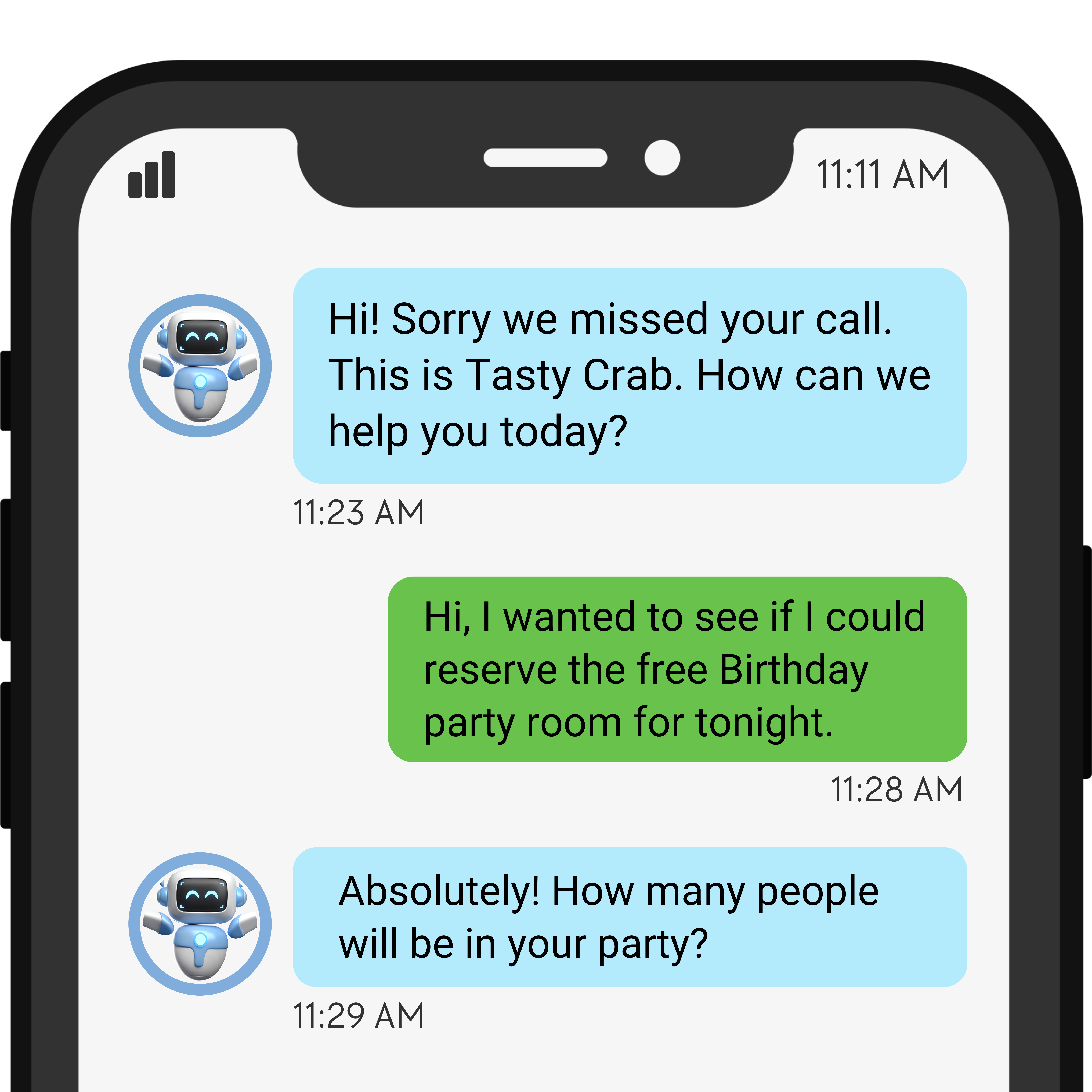 Send call or text reminders “Hi, this is Tasty Crab calling to remind you about your reservation tonight at 7 PM.”